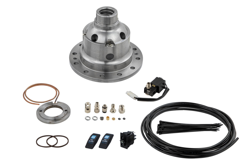 Il compressore rilascia la pressione necessaria per bloccare il differenziale e solitamente viene installato in una posizione adeguata all’interno del vano motore. L’accensione del compressore è automatica e serve per mantenere sempre costante la pressione necessaria per inserire il blocco differenziale. Gli interruttori, fissabili sul cruscotto, permettono di mettere in funzione e disattivare il bloccaggio. L’inserimento può avvenire anche con il veicolo in marcia grazie al tipo di pistone anulare applicato al differenziale ma si consiglia comunque una velocità ridotta. Quando il dispositivo viene disattivato, l’aria compressa fuoriesce dall’elettrovalvola e delle piccole molle aprono l’anello di sicurezza, liberando così il differenziale.