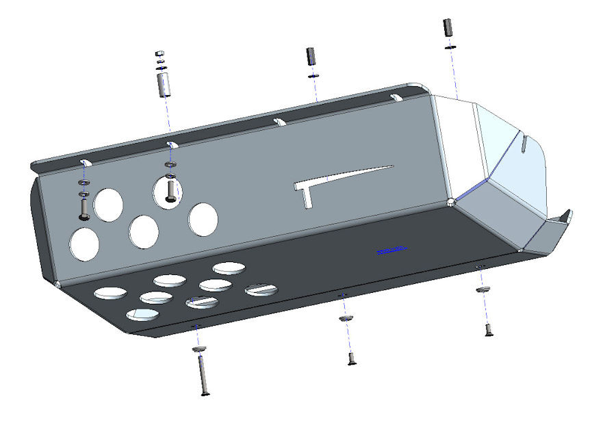La piastra di protezione è compresa di kit montaggio e bulloneria. L'installazione non prevede modifiche al veicolo in quanto vengono sfruttati i fori già presenti nel telaio.