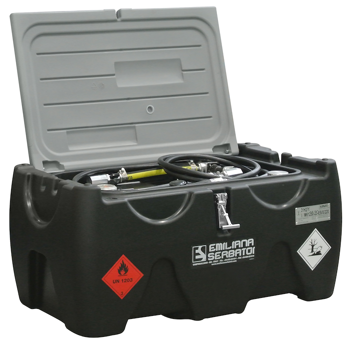 Serbatoio trasportabile per benzina prodotto in polietilene lineare con stampaggio rotazionale, progettato per essere il più compatto possibile ed avere il miglior rapporto dimensioni esterne/capacità utile esistente sul mercato; ciò permette di utilizzarlo nei pick-up con o senza copertura e di occupare pochissimo spazio.