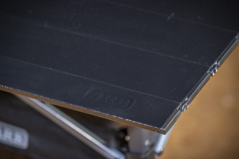Ogni gamba può essere regolata in modo indipendente per garantire la stabilità su superfici irregolari e l'altezza del tavolo può essere variata da 79 cm a 99 cm. Il telaio è dotato di staffe per il fissaggio del cestino in rete in dotazione, che consente di riporre il necessario.