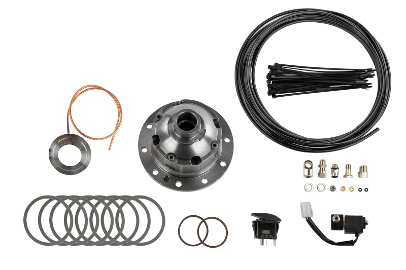 Il compressore rilascia la pressione necessaria per bloccare il differenziale e solitamente viene installato in una posizione adeguata all’interno del vano motore. L’accensione del compressore è automatica e serve per mantenere sempre costante la pressione necessaria per inserire il blocco differenziale. Gli interruttori, fissabili sul cruscotto, permettono di mettere in funzione e disattivare il bloccaggio. L’inserimento può avvenire anche con il veicolo in marcia grazie al tipo di pistone anulare applicato al differenziale ma si consiglia comunque una velocità ridotta. Quando il dispositivo viene disattivato, l’aria compressa fuoriesce dall’elettrovalvola e delle piccole molle aprono l’anello di sicurezza, liberando così il differenziale.