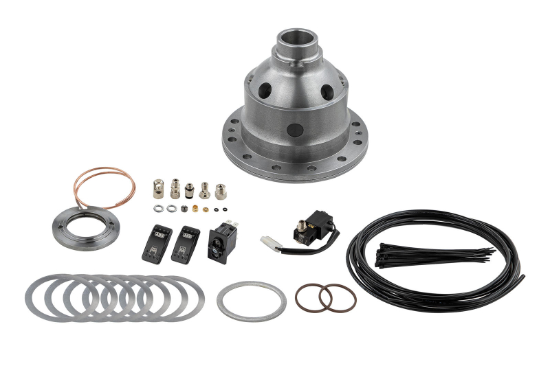 Il compressore rilascia la pressione necessaria per bloccare il differenziale e solitamente viene installato in una posizione adeguata all’interno del vano motore. L’accensione del compressore è automatica e serve per mantenere sempre costante la pressione necessaria per inserire il blocco differenziale. Gli interruttori, fissabili sul cruscotto, permettono di mettere in funzione e disattivare il bloccaggio. L’inserimento può avvenire anche con il veicolo in marcia grazie al tipo di pistone anulare applicato al differenziale ma si consiglia comunque una velocità ridotta. Quando il dispositivo viene disattivato, l’aria compressa fuoriesce dall’elettrovalvola e delle piccole molle aprono l’anello di sicurezza, liberando così il differenziale.