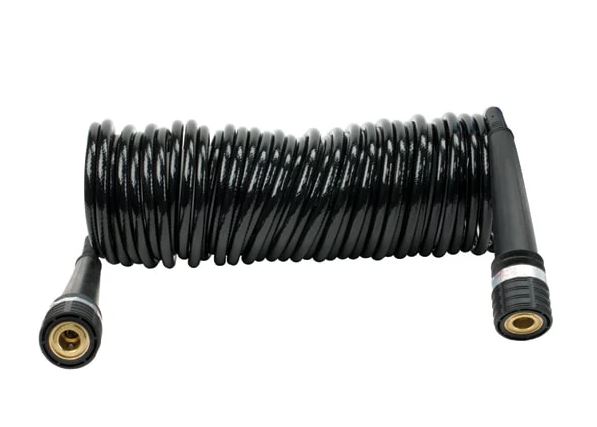 Tubo flessibile a spirale da 9 m, intrecciato internamente, fino a 200 PSI, con attacco rapido da 1/4" su entrambe le estremità.