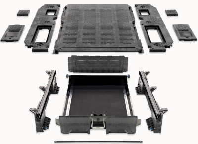 Cercando di massimizzare la capacità di stoccaggio ed eliminando lo spazio sprecato nel cassone, DECKED ha creato un cassetto unico per sostituire i due cassetti asimmetrici precedentemente offerti. La riduzione della capacità di carico da 900 kg a 454 kg riflette in modo più accuratoi casi di utilizzo e le capacità dei moderni pick up. In compenso, ha però consentito agli ingegneri di creare un cassetto singolo con una capacità di carico di 180 kg. Con il 30% in più di capacità di stoccaggio dei cassetti rispetto alle versioni precedenti, i clienti ora avranno spazio più che sufficiente per i loro strumenti, attrezzatura da campeggio o qualsiasi cosa si abbia necessità si caricare. Questo cassetto può anche essere riconfigurato in un grande pianale scorrevole rimuovendo i lati di esso per un migliore accesso.